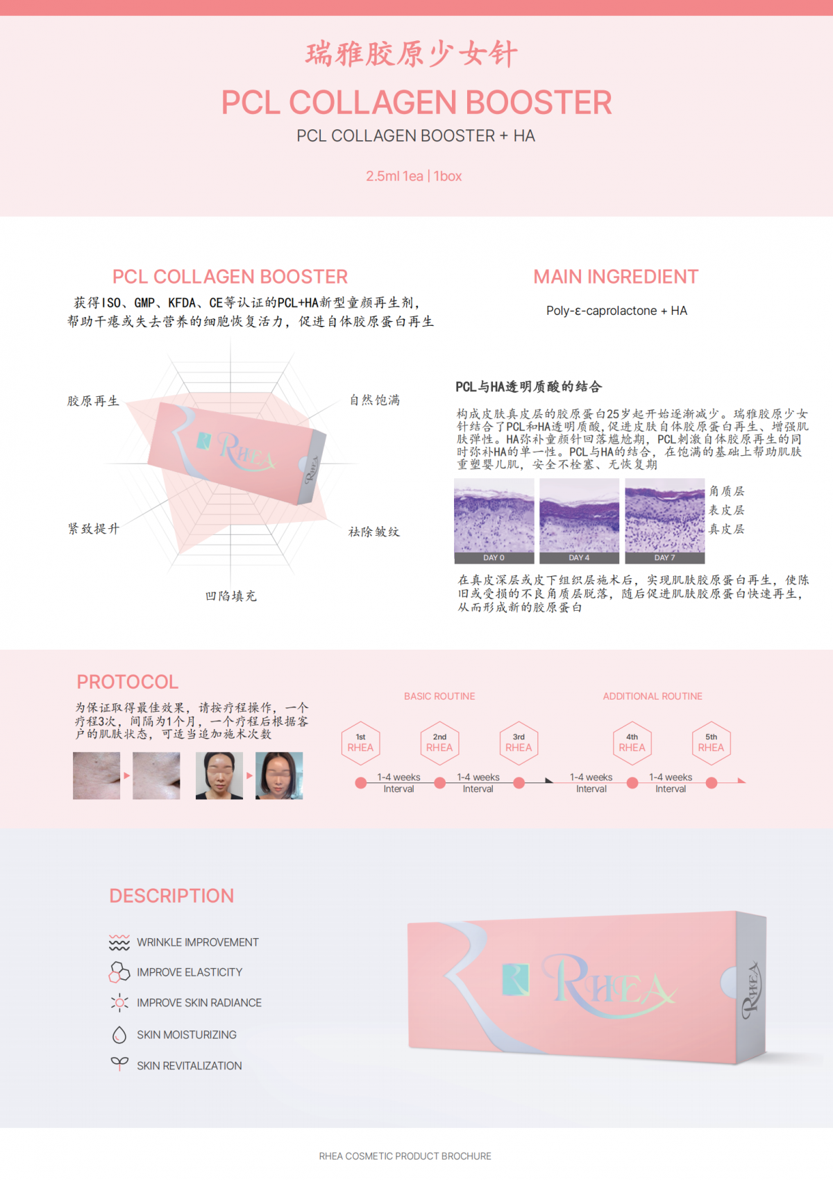 Rhea Collagen Needle for girls is the sixth generation of Collagen medicine for children's face containing Pcl Collagen Booster + Ha. It was jointly developed by Korea Skin Research Institute and Russia Royal Medical Research Institute, and has been certified by GMP, KFDA, CE, etc. Using the exclusive technology to combine Pcl and Ha to fill, it can also promote the regeneration of collagen, and break the defects of single product on the market, as well as the complex mixing of multiple products and other shortcomings. A full effect product of filling and baby face.